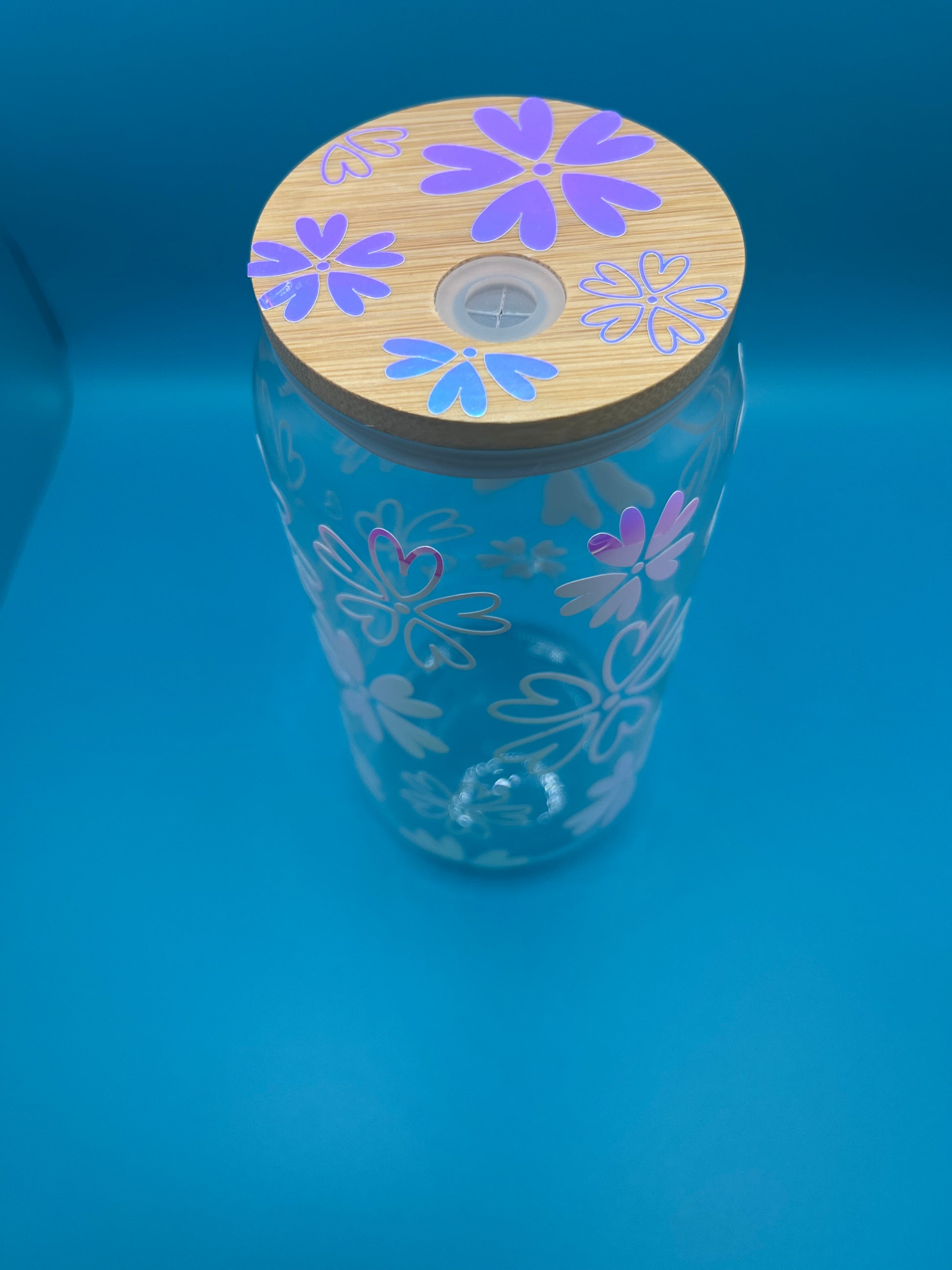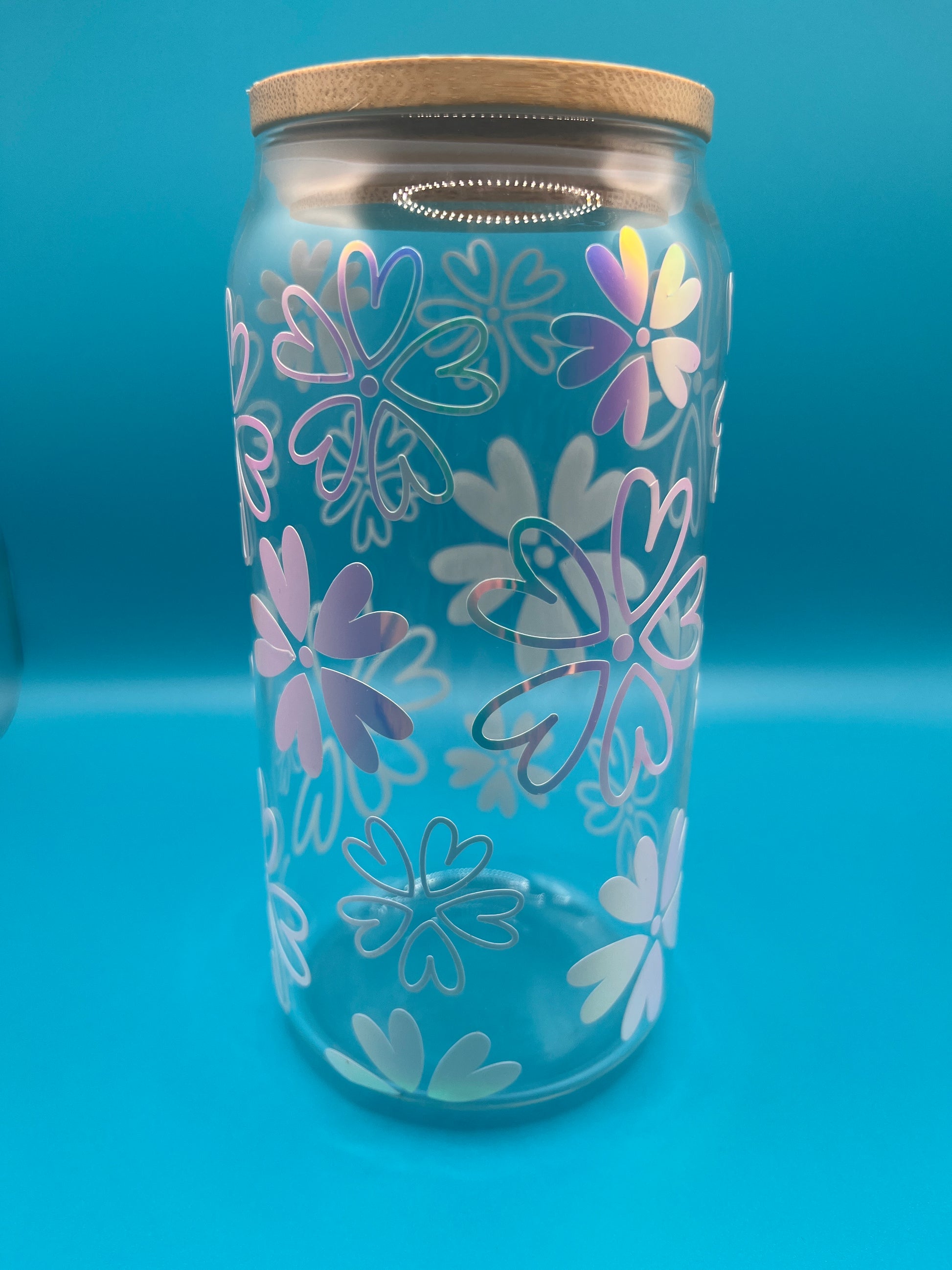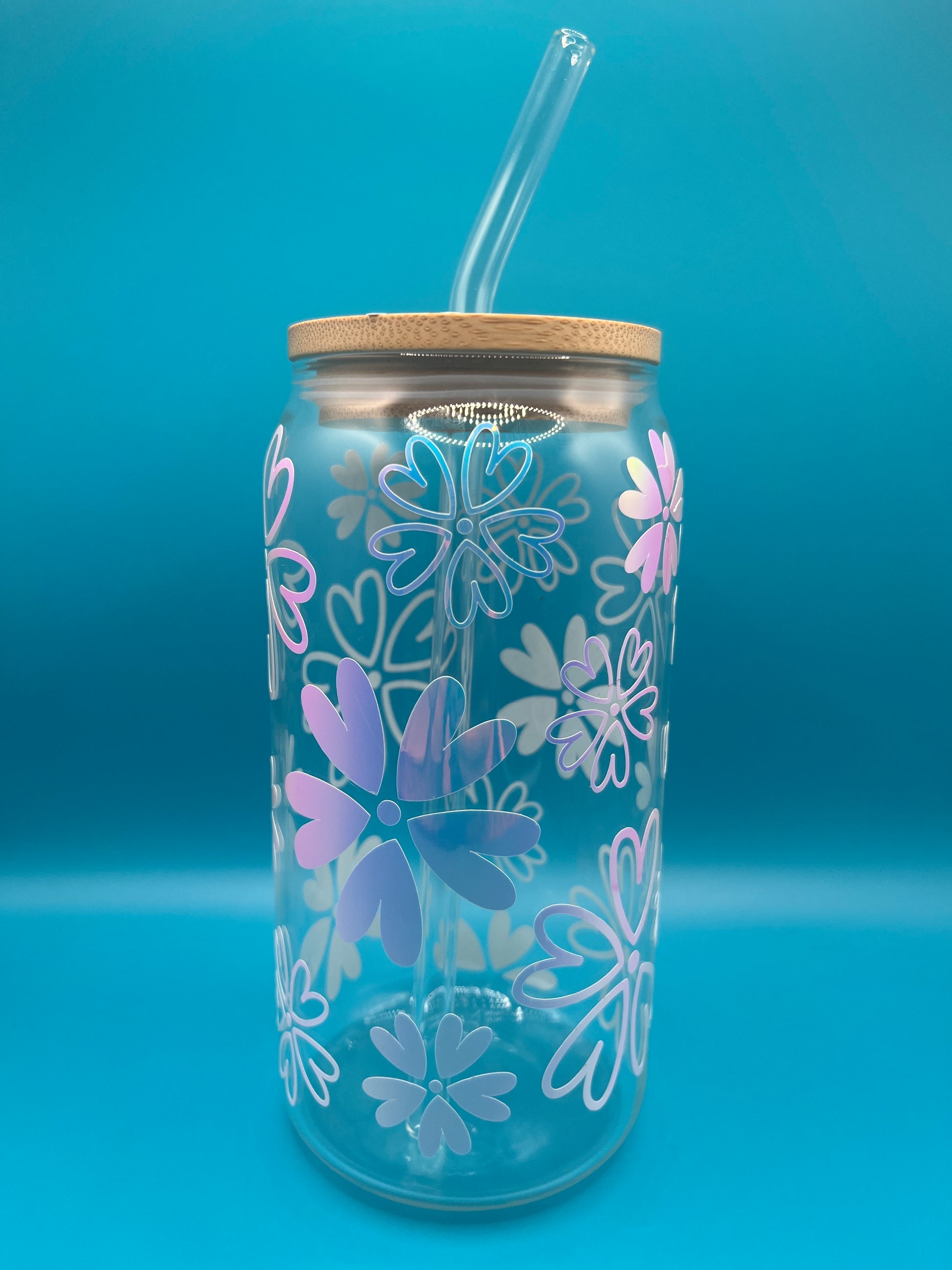 Sip in style with this beautifully decorated 16 oz glass cup! Adorned with delicate floral hearts made of high-quality permanent vinyl, this cup is the perfect blend of elegance and functionality. Whether you’re enjoying your favorite iced coffee, tea, or smoothie, this cup will make every sip feel extra special.