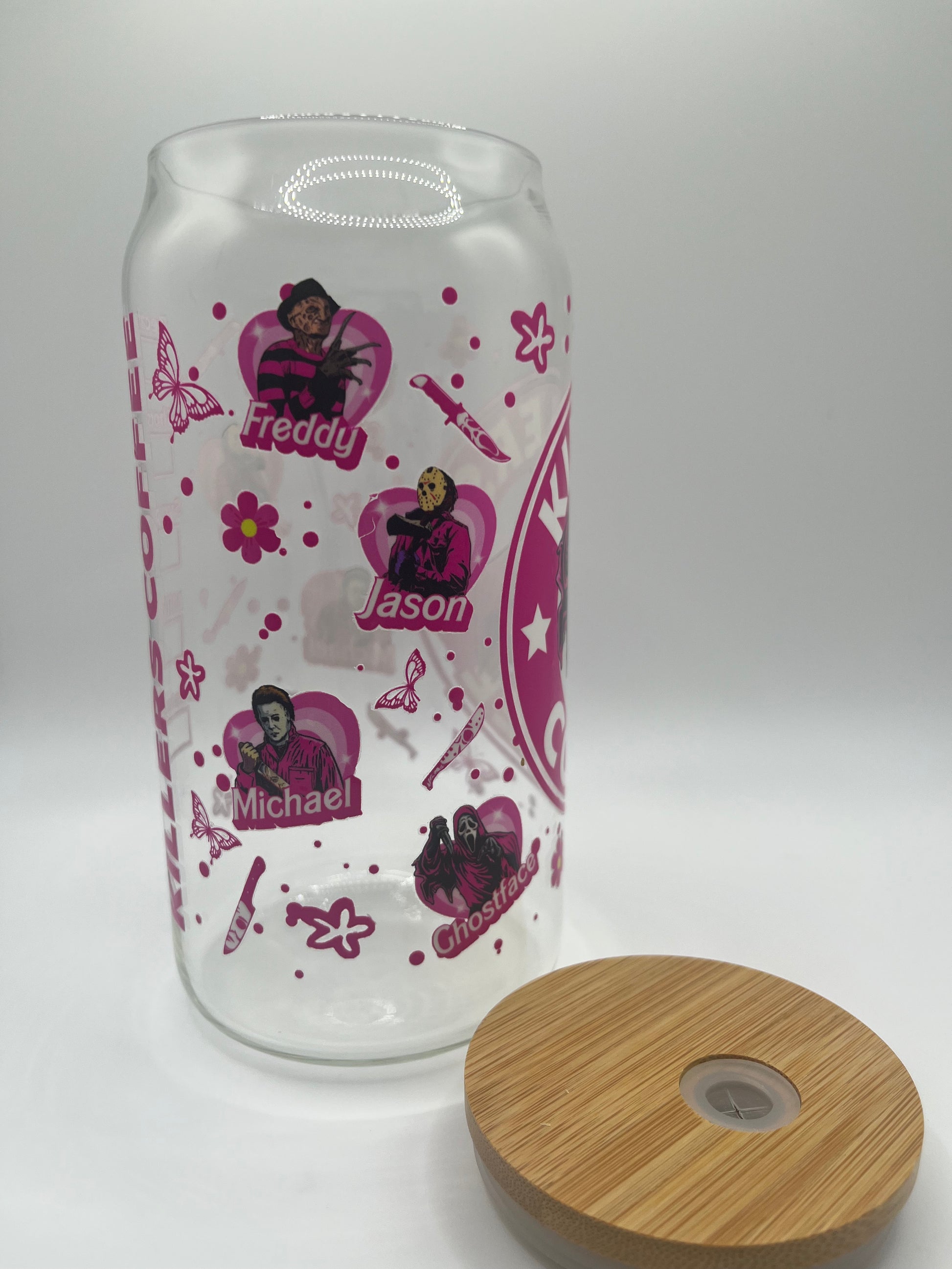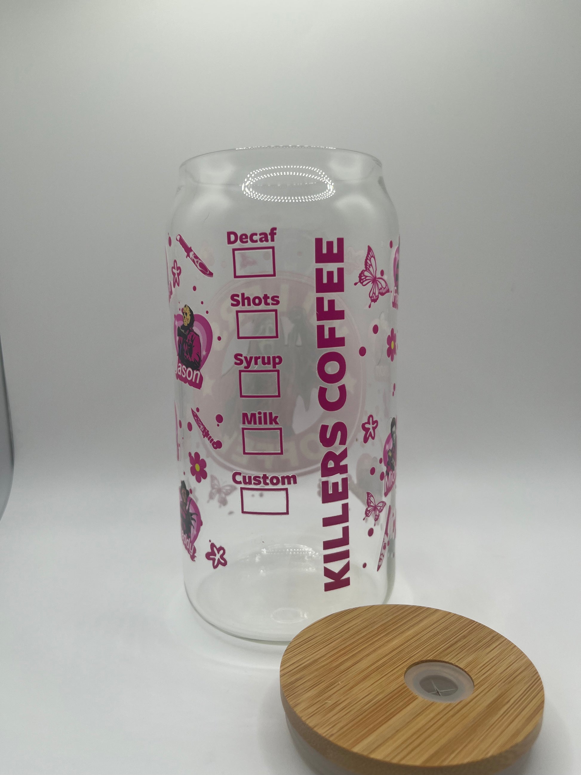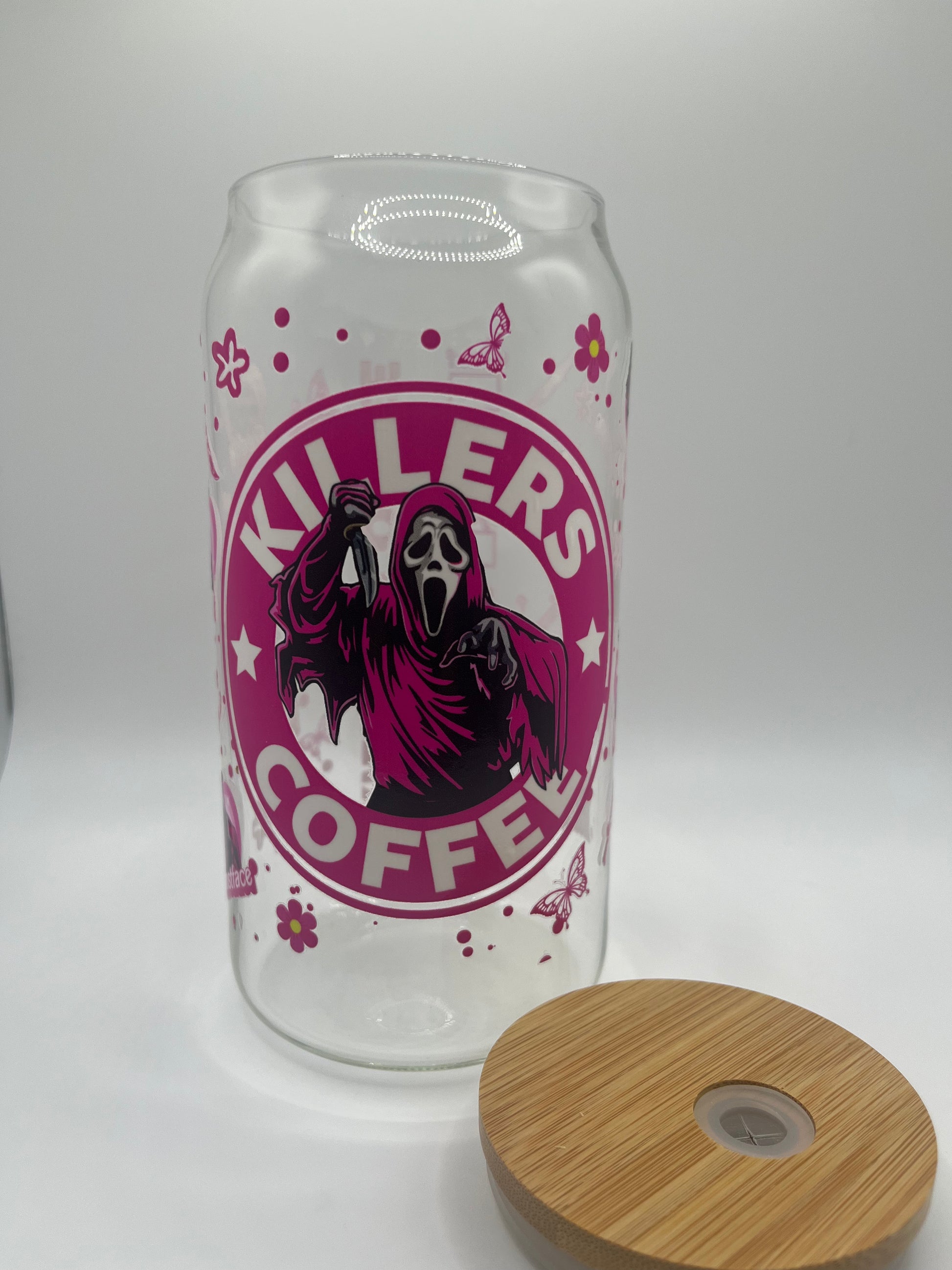 Sip your favorite brew in style with our Ghost Killer Coffee Cup, a thrilling homage to iconic horror movie legends with a splash of pink romance. This 16oz glass cup features a sleek design, complete with a bamboo lid and glass straw, making it the perfect mix of spooky and sweet.