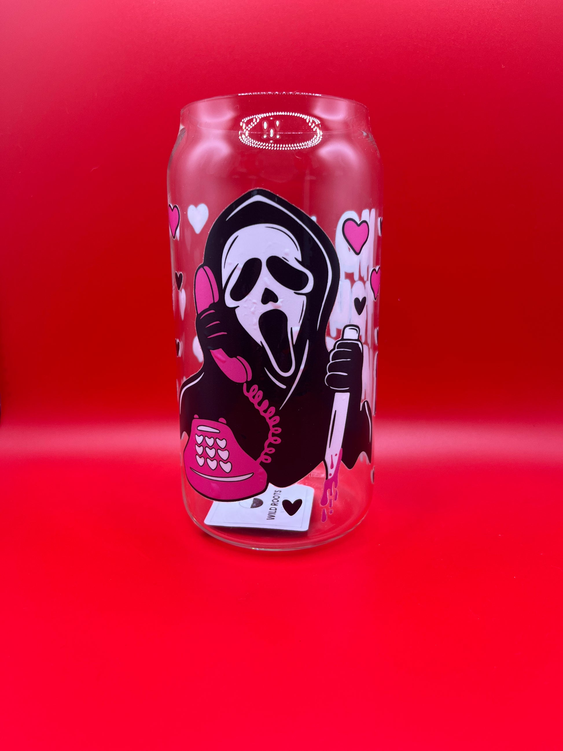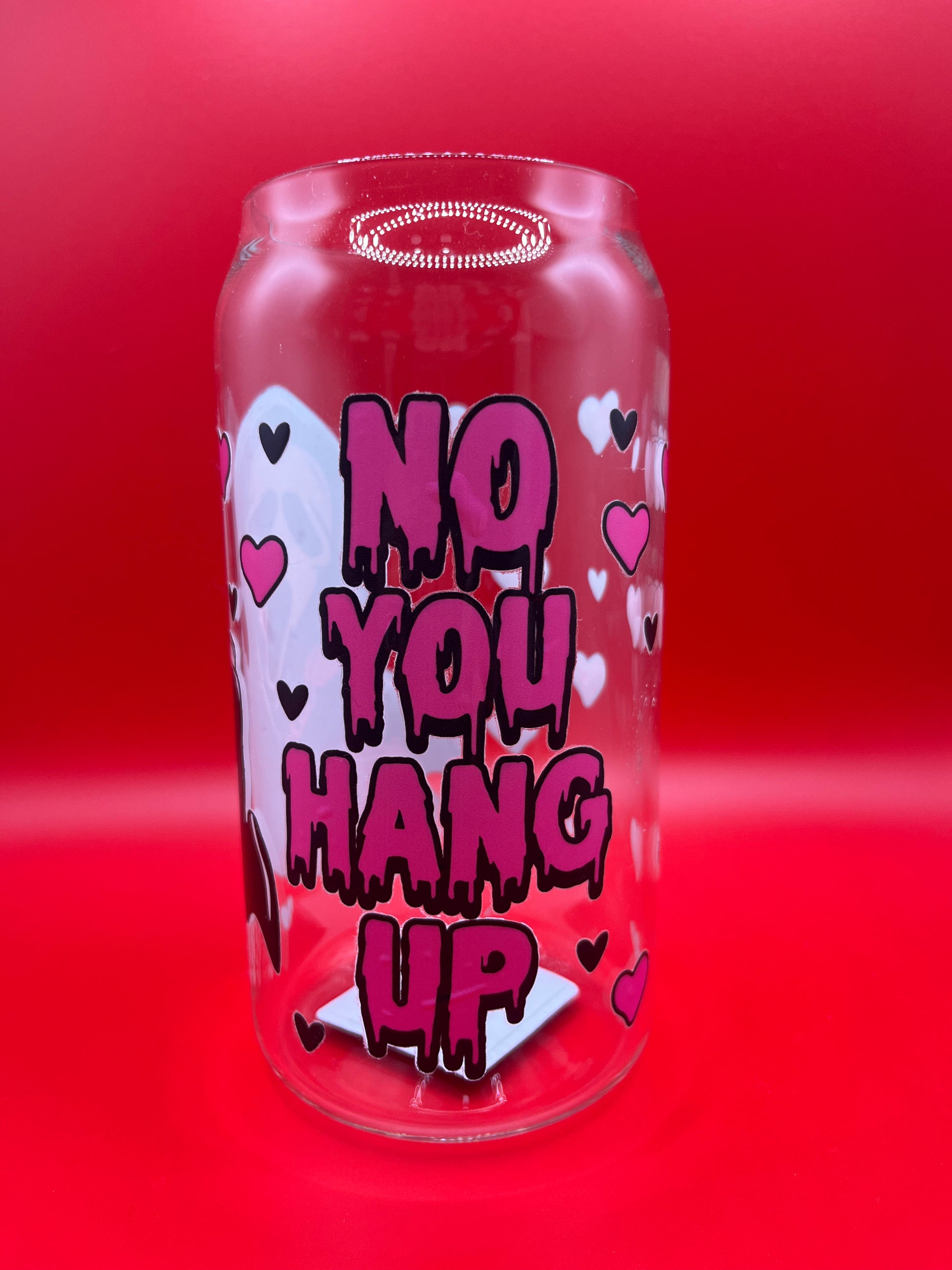 Add a little spooky romance to your sips with this 16oz glass cup, featuring a playful nod to Ghostface iconic line: No, you hang up! Perfect for horror fans who love a mix of cute and creepy, this cup is ideal for iced coffee, tea, or your favorite cold drinks.