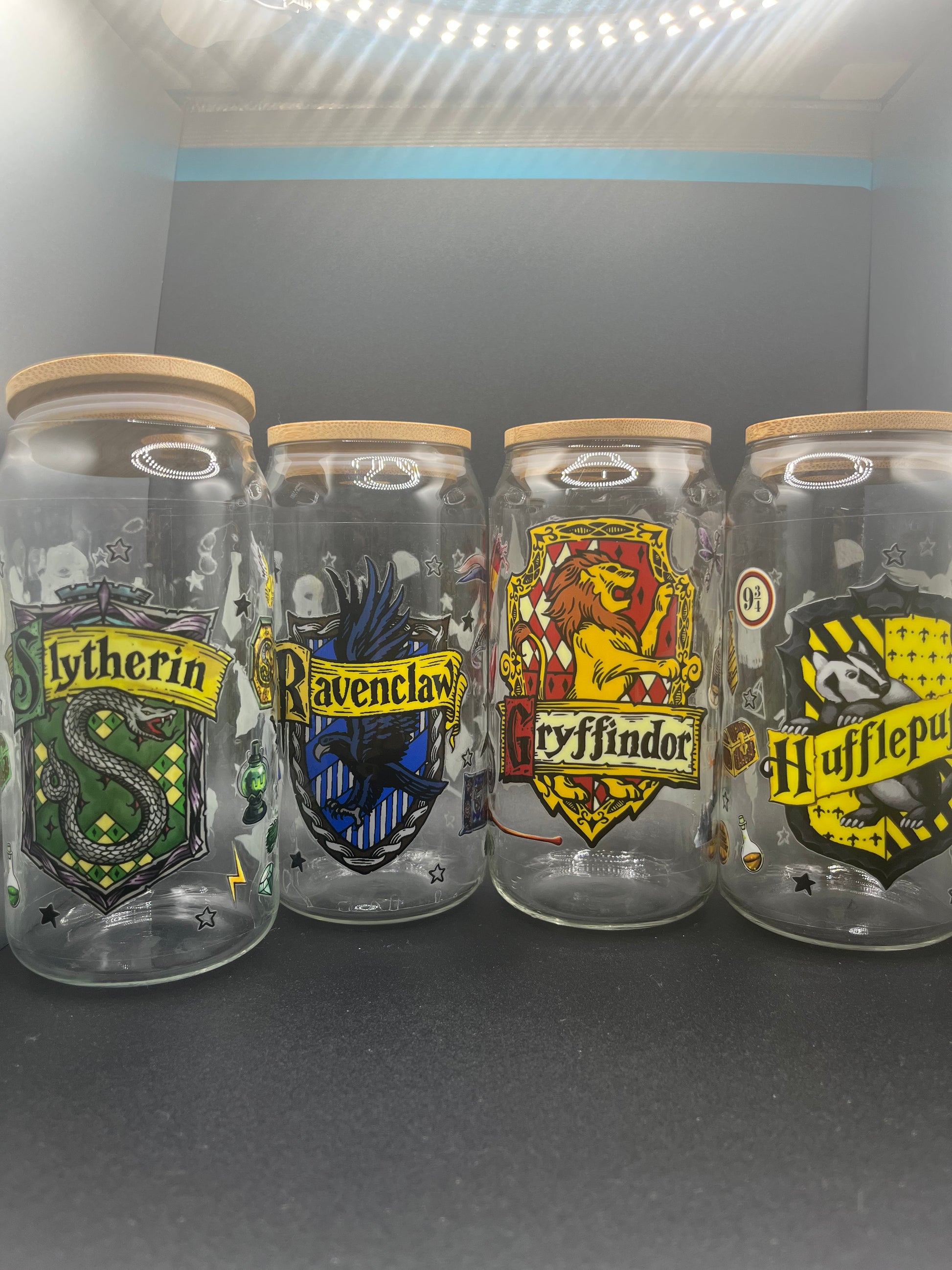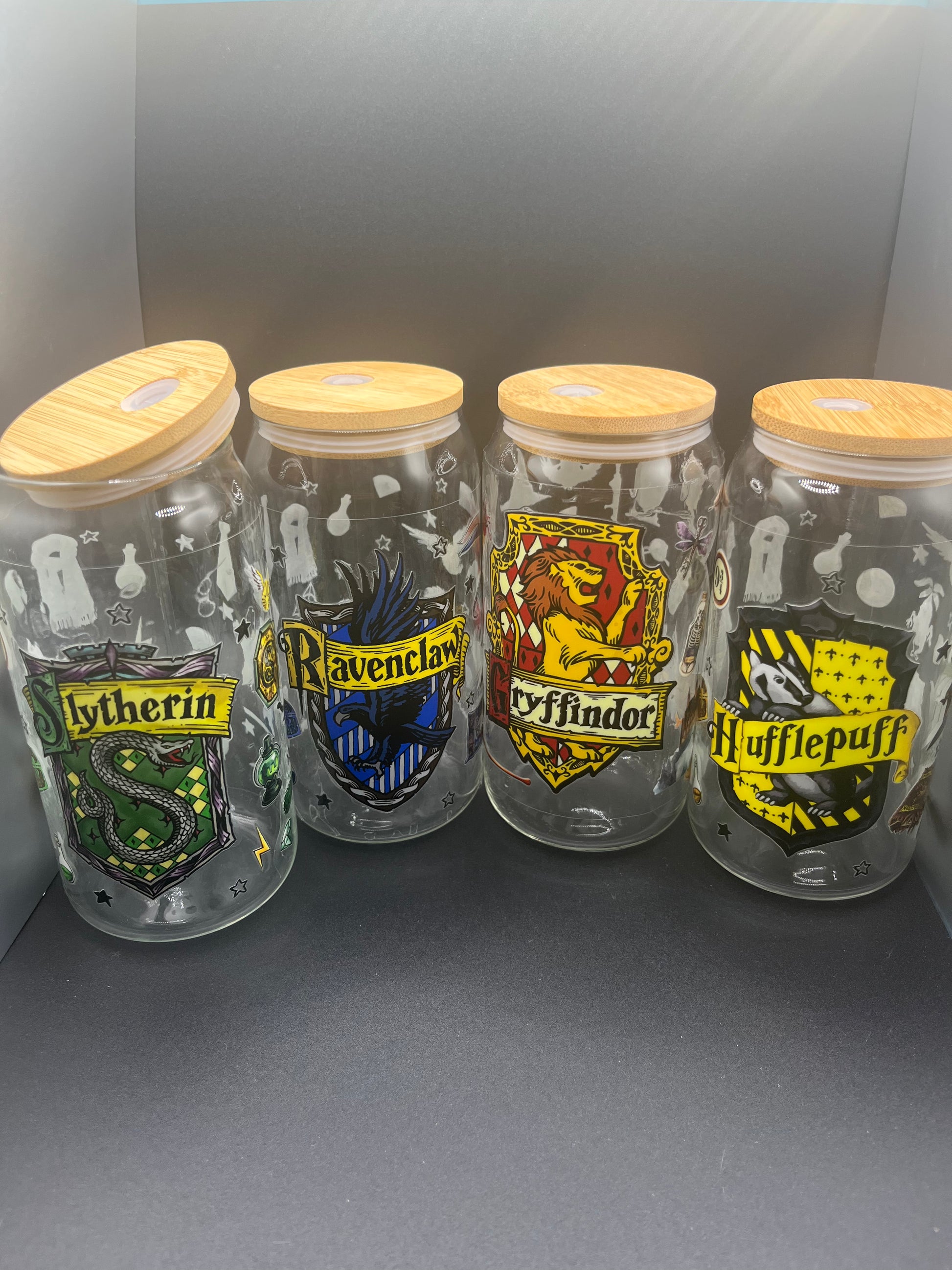 Show off your Hogwarts house pride with our 16 oz Glass Cup, featuring beautiful designs inspired by the four legendary Hogwarts houses: Gryffindor, Slytherin, Ravenclaw, and Hufflepuff. Whether you’re re sipping on iced coffee, tea, or butterbeer, this stylish and eco-friendly cup is perfect for any witch, wizard, or muggle!